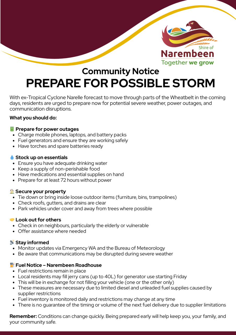 Please send Confidential, Private or Sensitive information, to ceo@narembeen.wa.gov.au