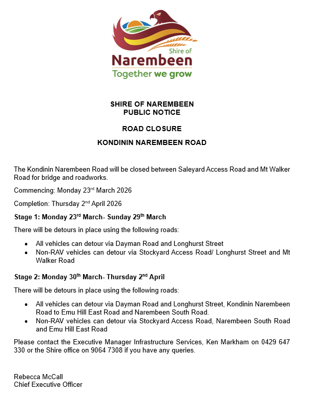 Road Closure - Kondinin Narembeen Road